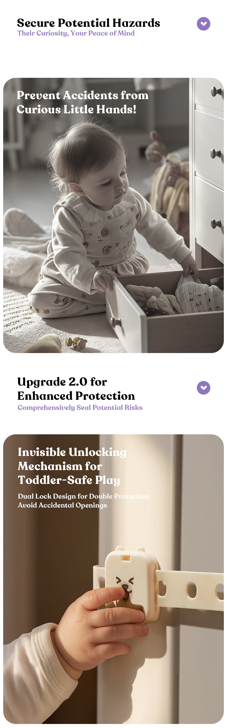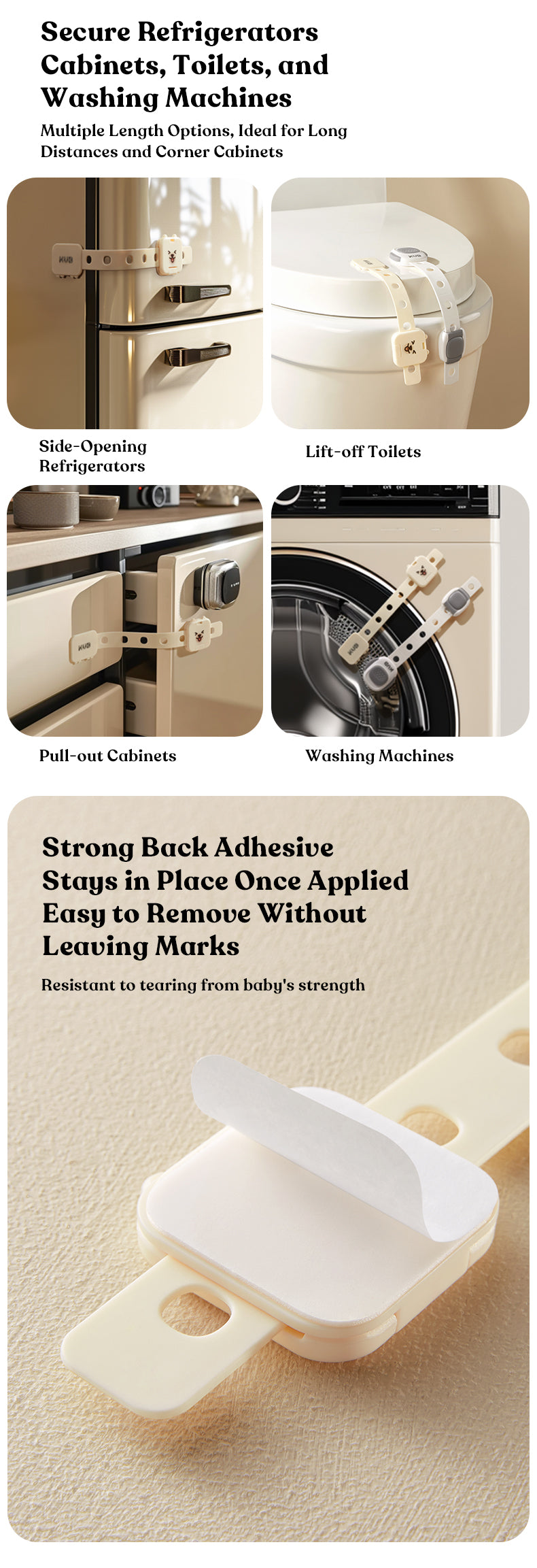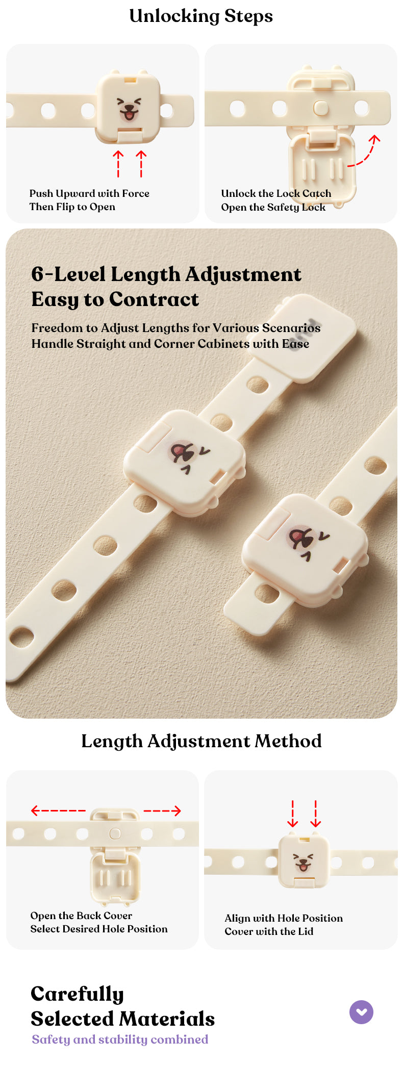 3M adhesive for stable and traceless installation and removal, 360° self-weighted drop design for smooth operation without sticking, adjustable in 5 gears to control length freely, double-lock buckle to always guard smart babies from opening, locking danger to ensure safety.
