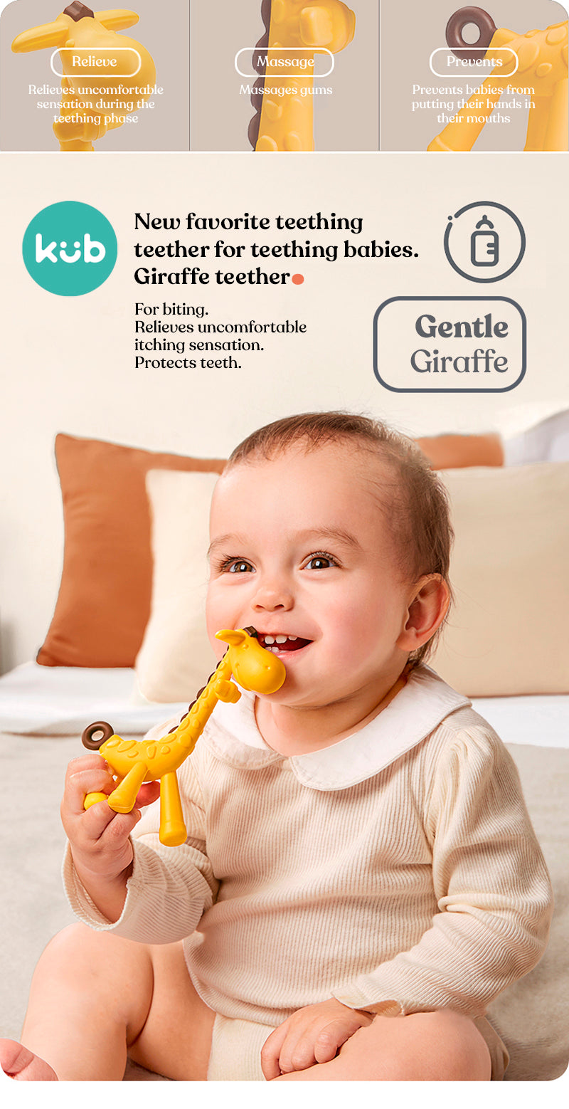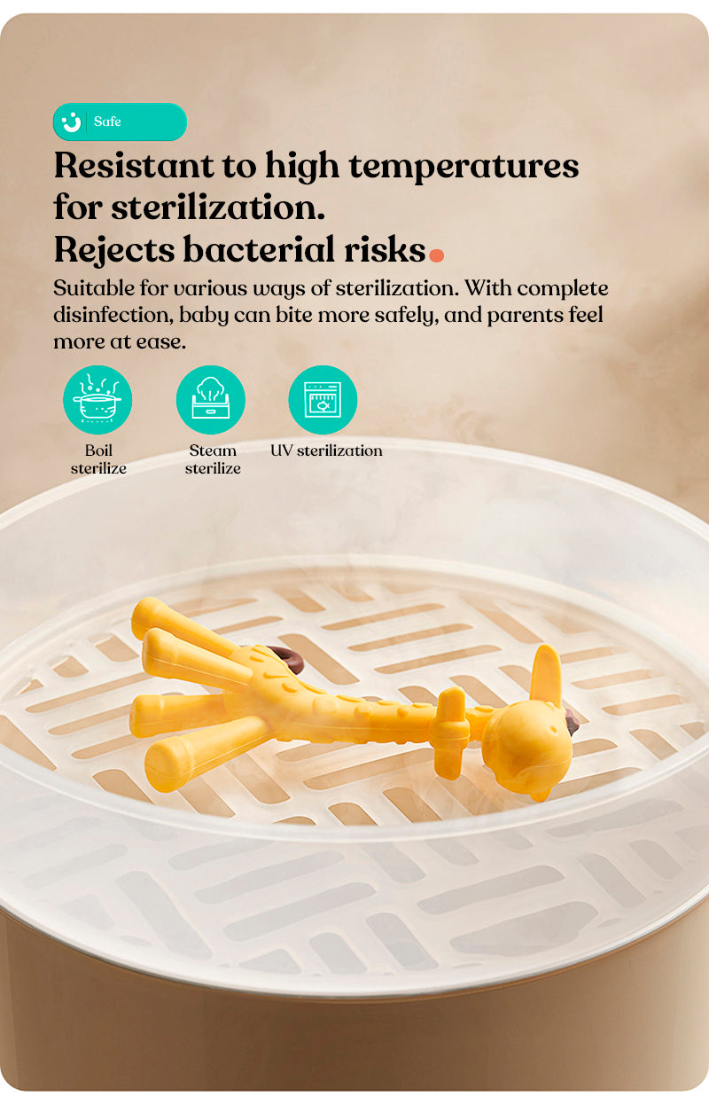 Soft and elastic, gentle on gums when bitten, cute design resistant to high-temperature sterilization, comes with a dust-proof storage box for clean and tidy storage, easy to grip with a long-necked deer shape.