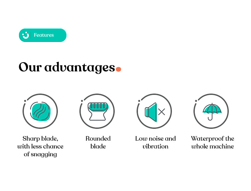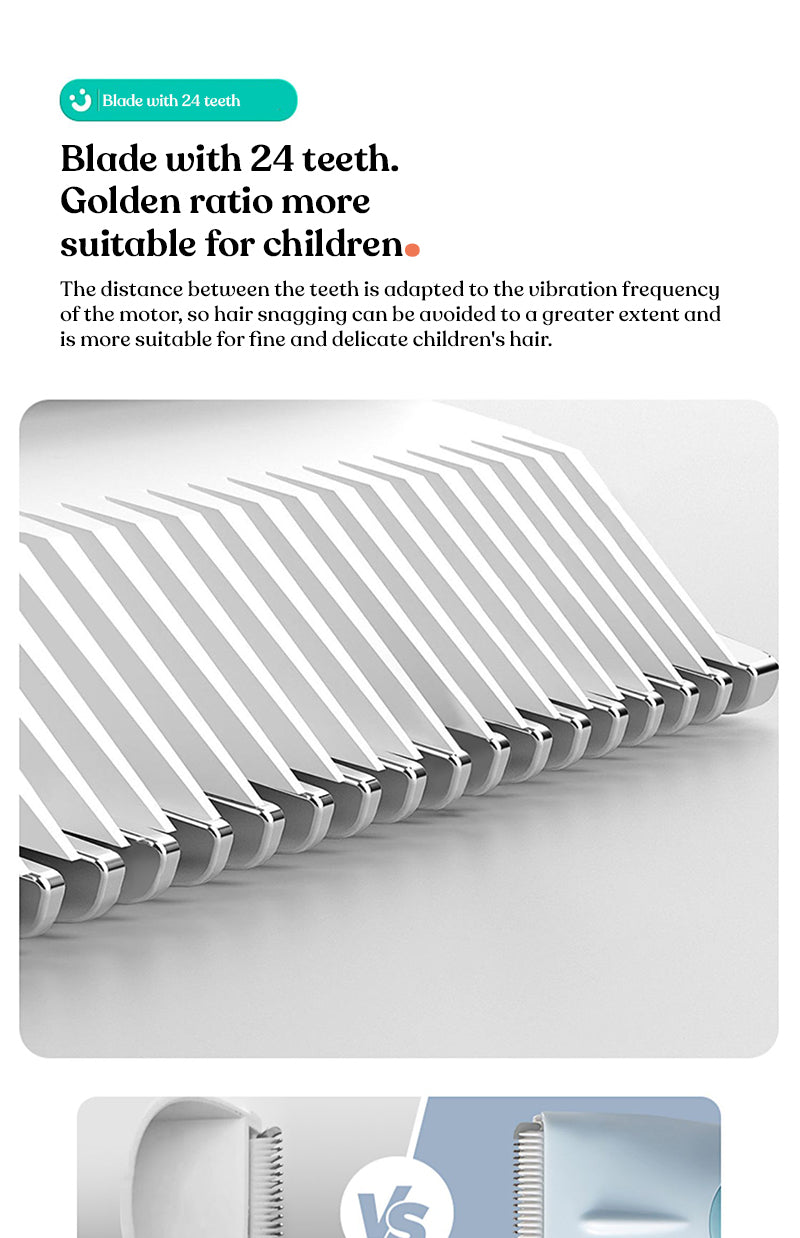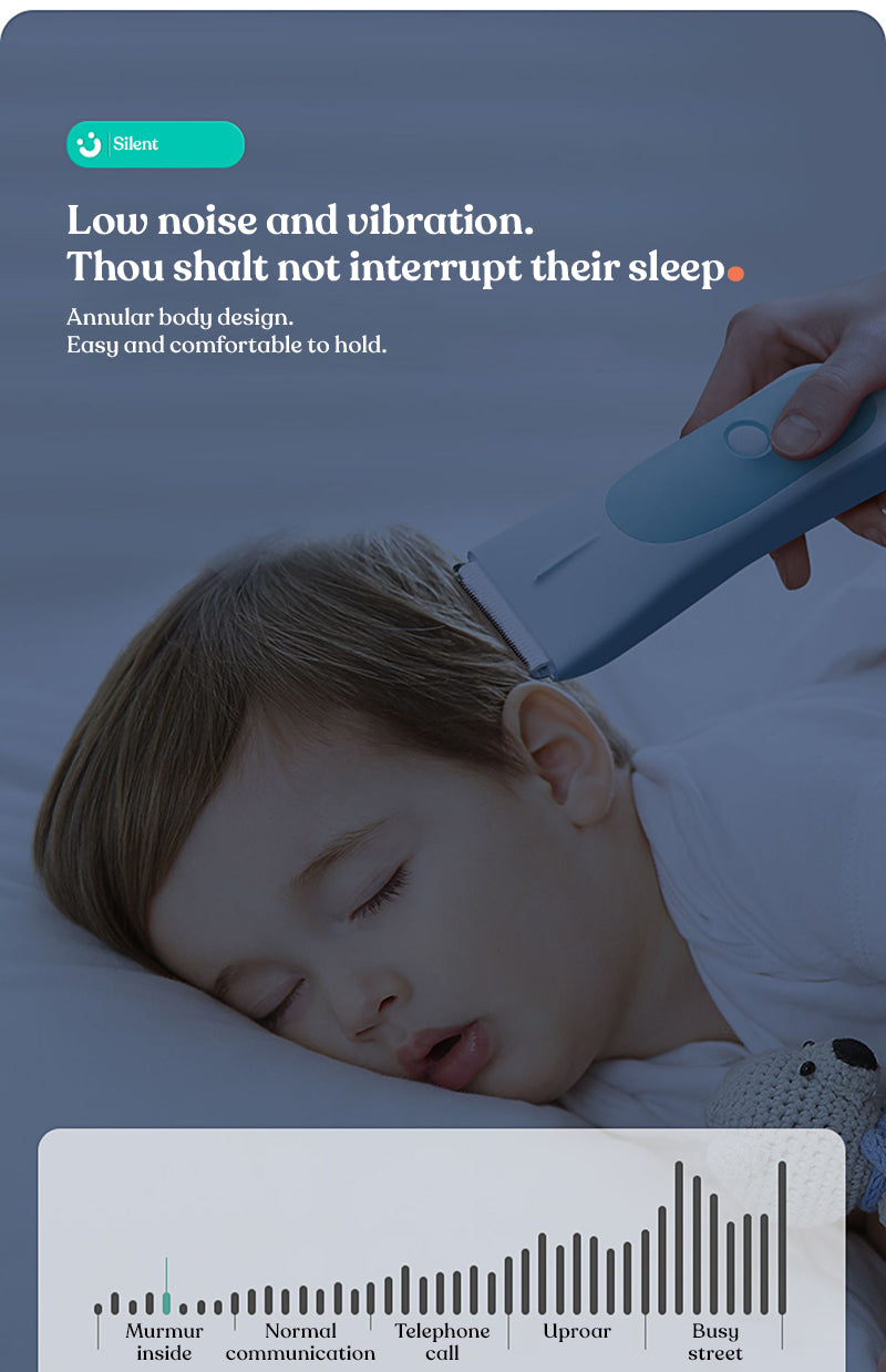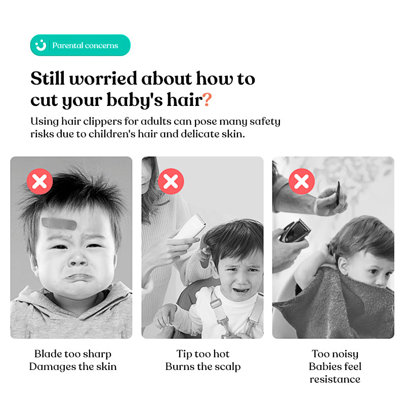 Long-lasting battery life, low noise, gentle sound, safe waterproofing, fully waterproof device, rounded R angle to prevent scalp injury, designed specifically for babies, Tony can cut hair at home without crying or fussing.