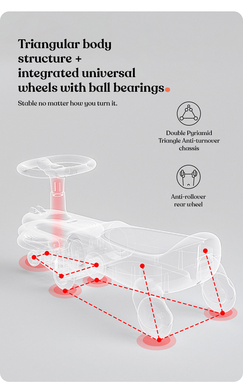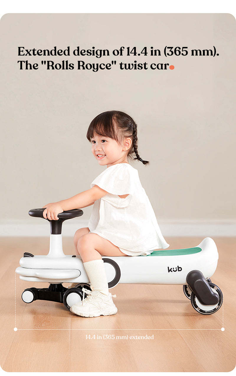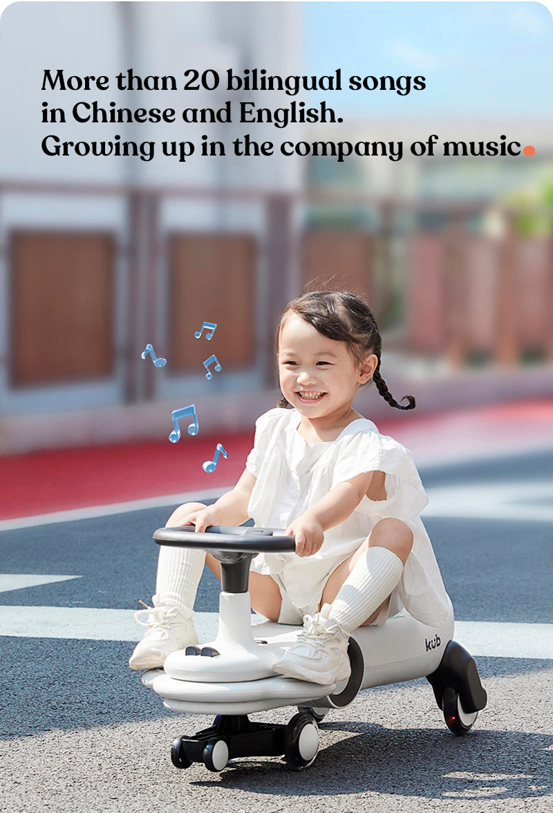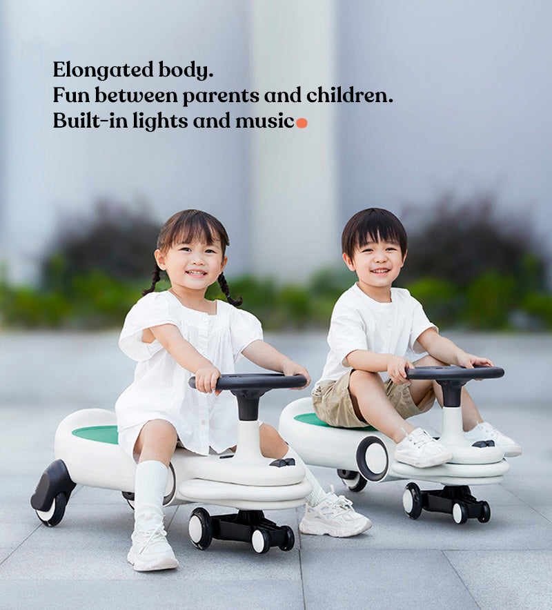 20+ bilingual music for growth with built-in BGM (background music), upgraded load-bearing capacity, moms can also sit together. Equipped with speakers and cool flashing lights, eye-catching magnetic flash. With a 365mm extended design, it's the Rolls-Royce of twist cars.