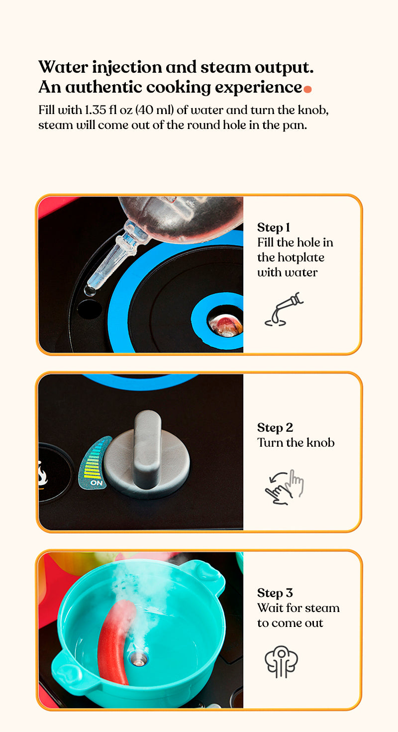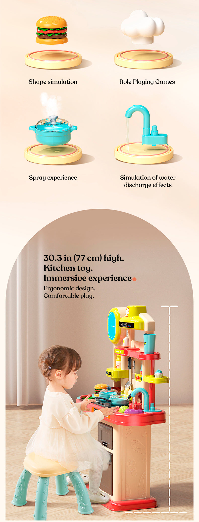 Fun playmate with sound and light effects, manually press for continuous water flow, realistic touch with simulated ingredients, large kitchen with spray water feature, increased weight for stability and prevents tipping.