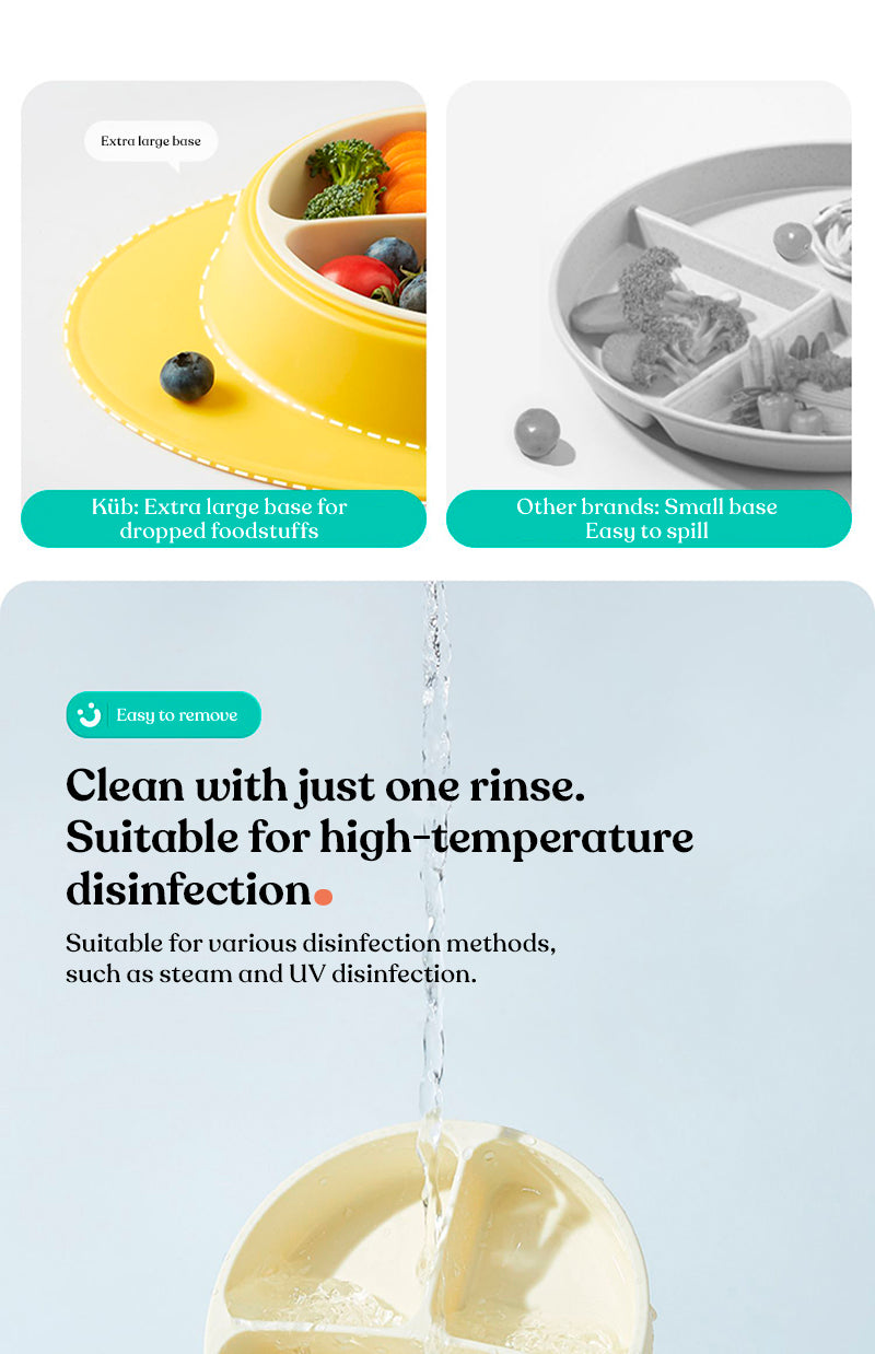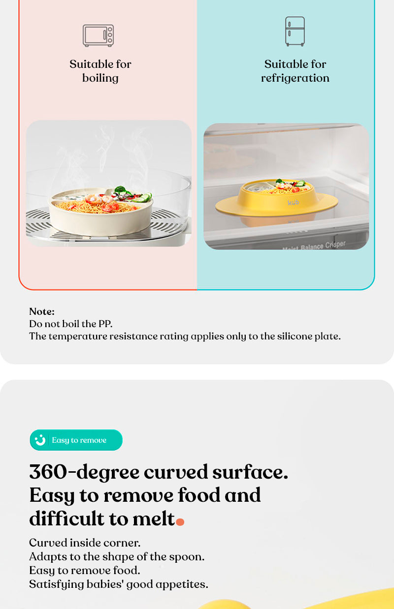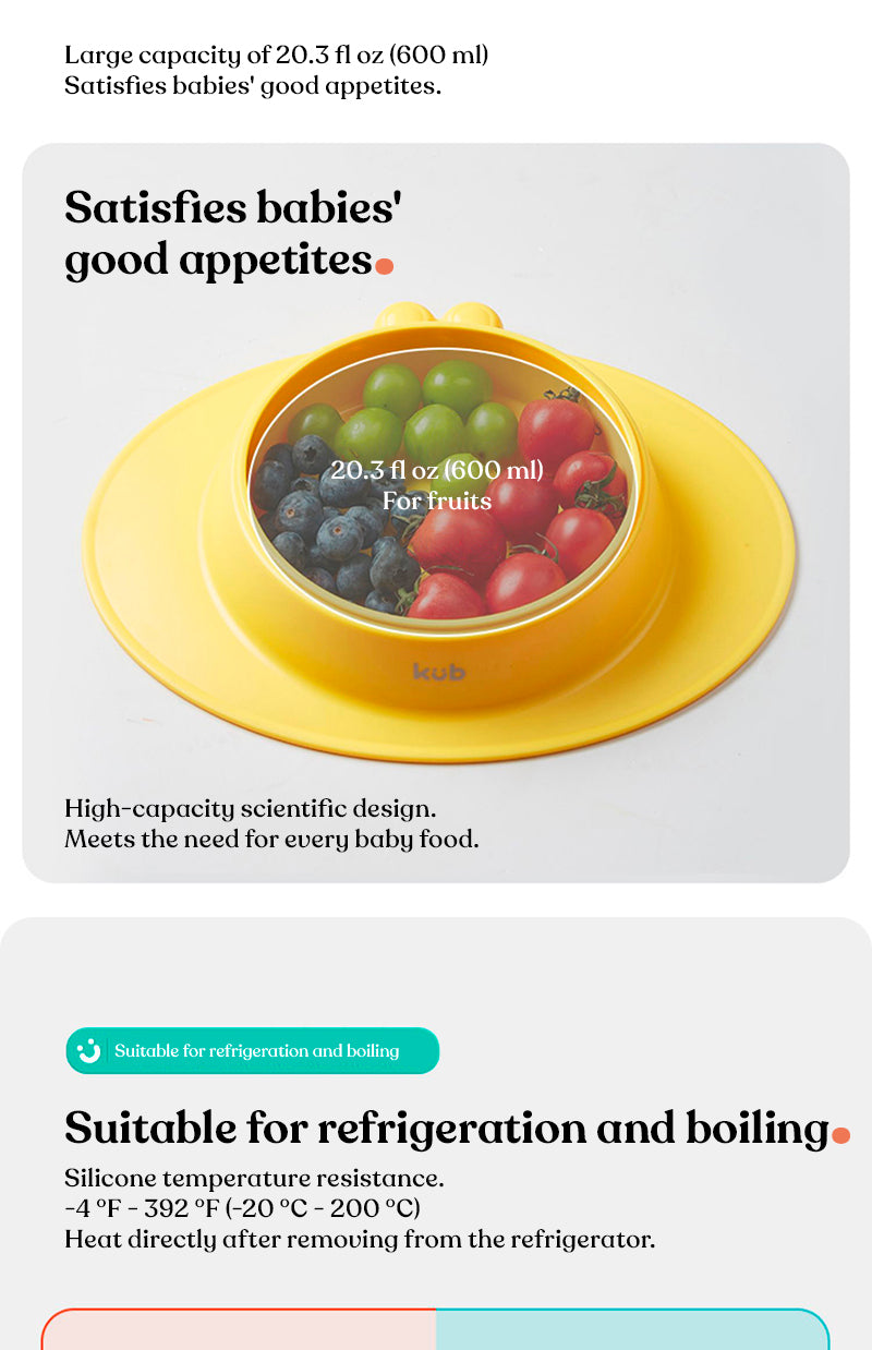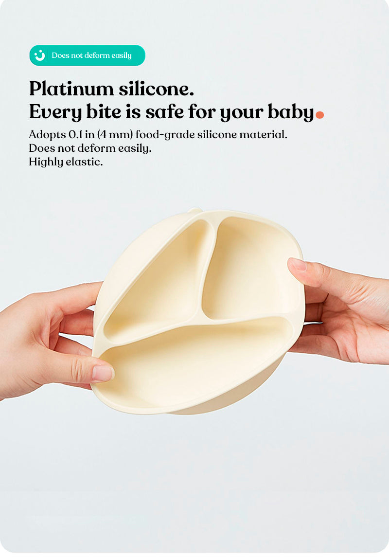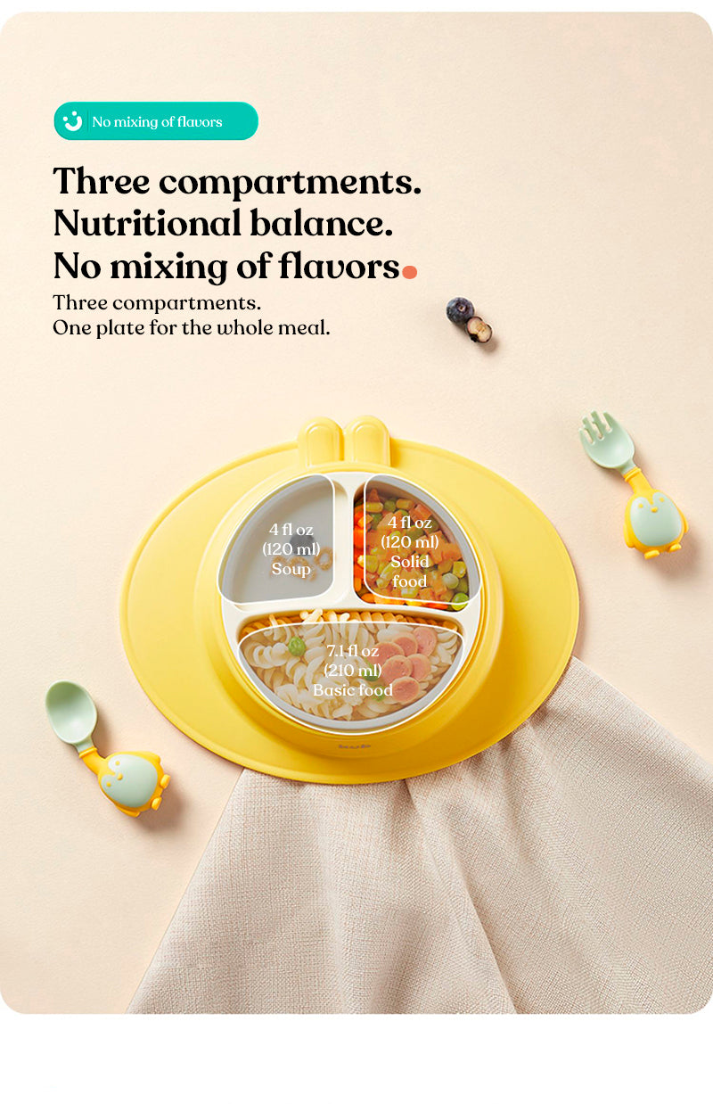 Versatile meal plate for easy food pairing, strong suction to prevent curious babies from knocking over, 360-degree curved surface for easy scooping without spills, food-grade material ensures safety with every bite, three compartments for balanced nutrition without mixing flavors, 600ml large capacity suitable for refrigeration and steaming.