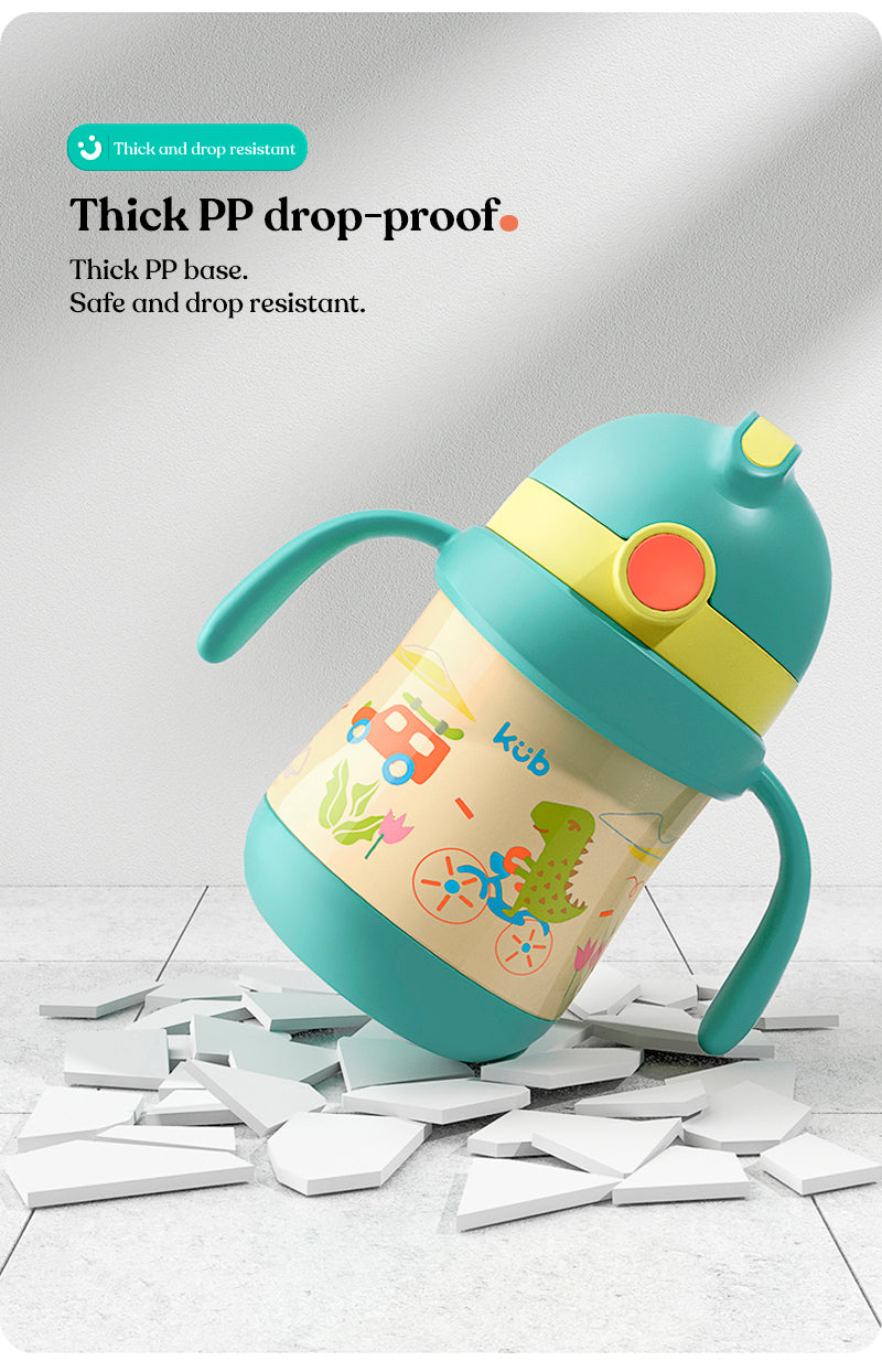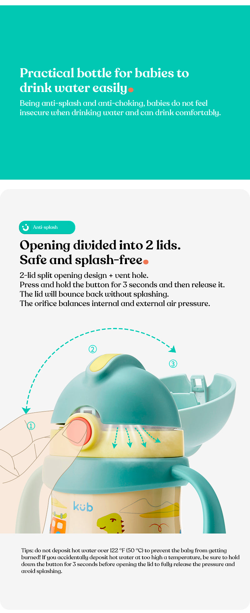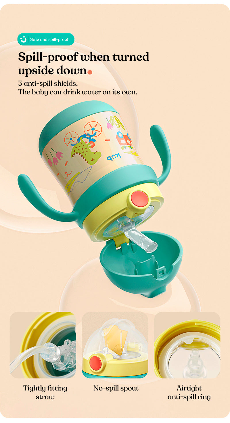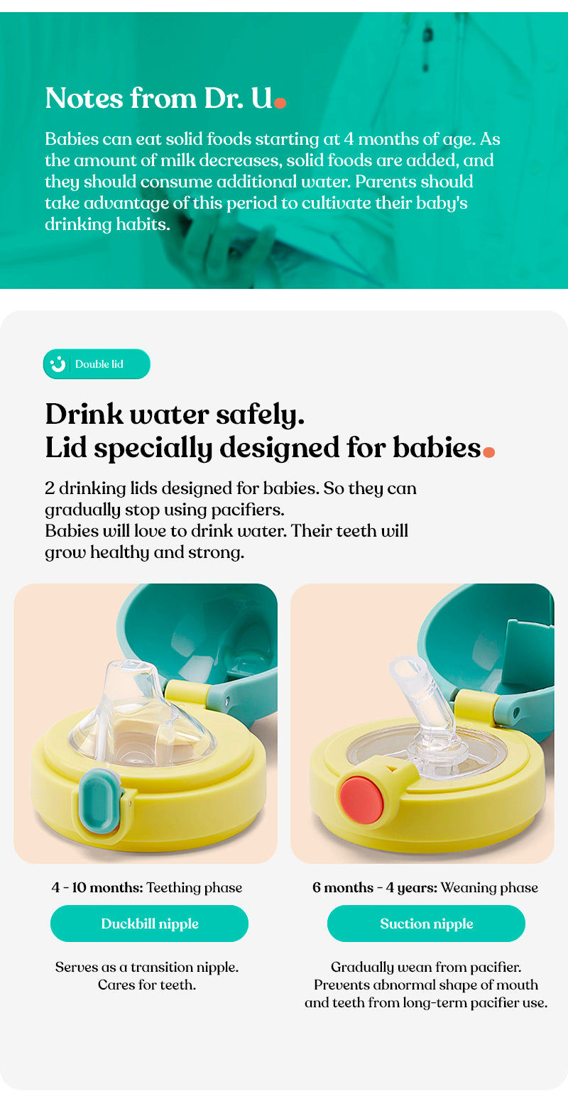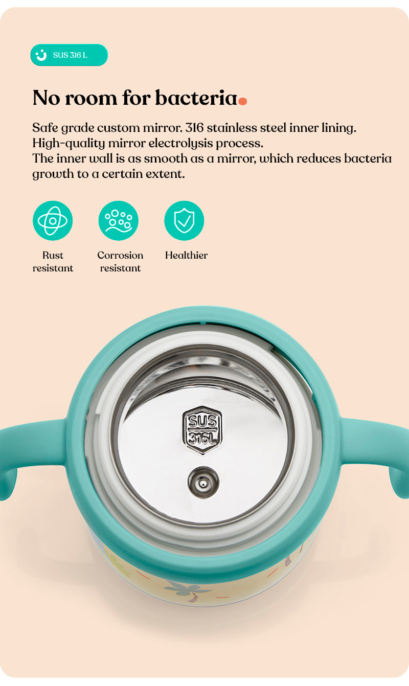 Custom-designed for young infants with two stages of drinking, thickened to resist drops, versatile cup with handle and strap for free combinations, spill-proof when inverted to prevent scalding, six layers for long-lasting heat retention, anti-choking design, food-grade 316 stainless steel.